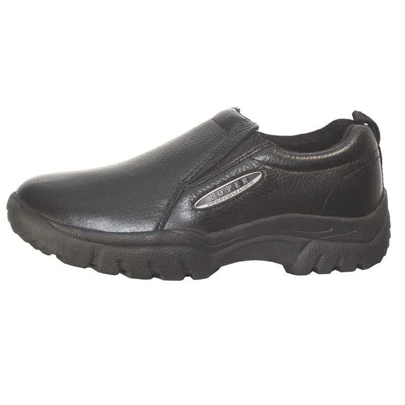 Men’s Roper casual slip on shoe in tumbled black leather, designed for comfort and style with twin gore pattern for easy fit, removable insole, non-marking rubber outsole and nylex lining.