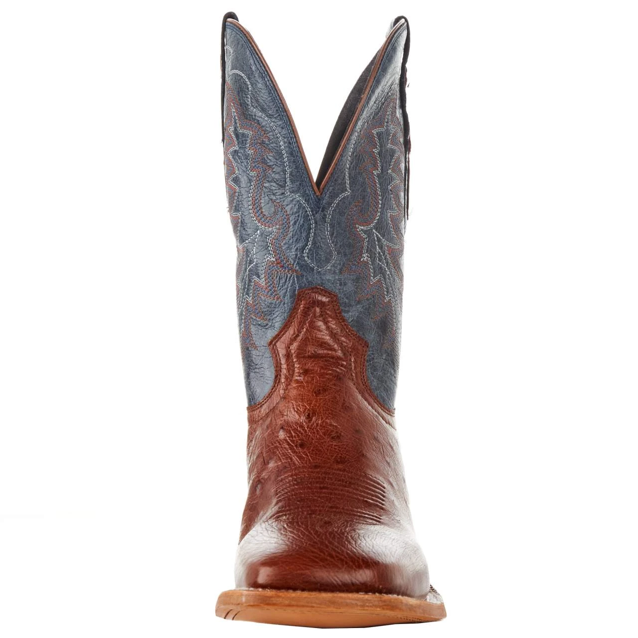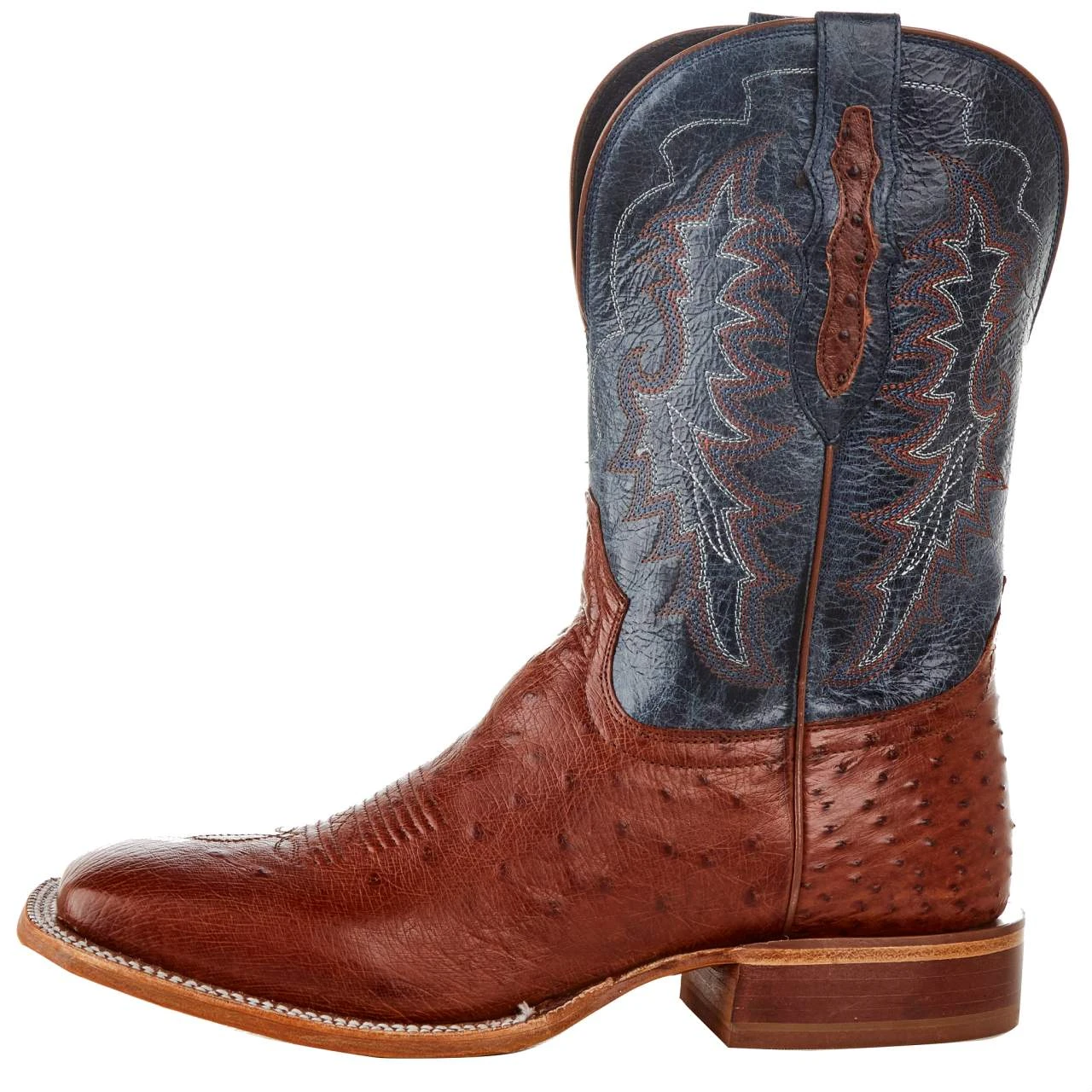 The 11ā Murillo in brandy is more than just a handsome-looking boot. The brandy smooth ostrich vamp and navy goat upper match up for a bold and classy look. The wide square toe and the Removable Cushion ComfortĀ® Insert leave plenty of room and comfort for your feet, while the leather outsole and ¾ double-stitch welt complete this expertly crafted boot.
